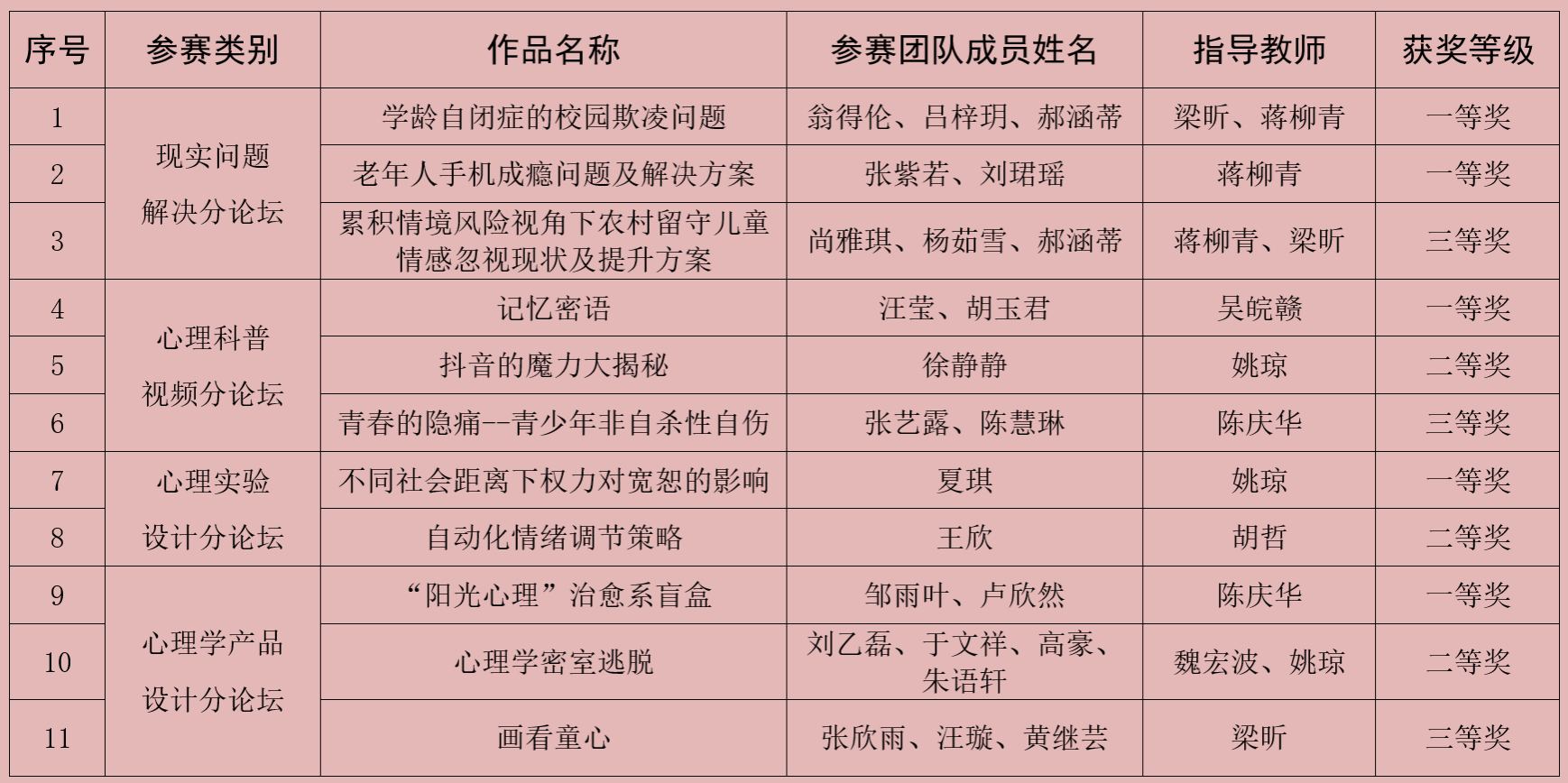 近日,由安徽省高等学校教育学类合作委员会、安徽省心理学会和安徽师范大学教育科学学院共同主办的“安徽省首届心理学专业本科生创新创业论坛”在安徽师范大学落下帷幕。永利集团304am登录应用心理学专业11个本科生团队获得一等奖5个,二等奖3个,三等奖3个,一等奖数量居参赛院校首位,学校荣获优秀组织奖。