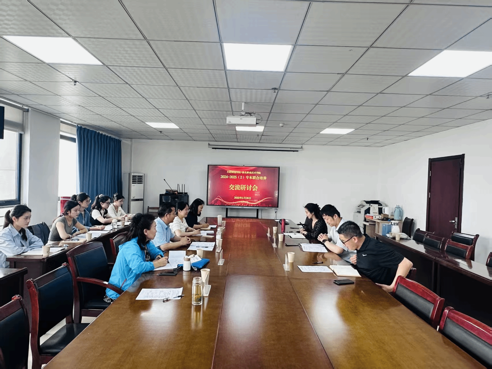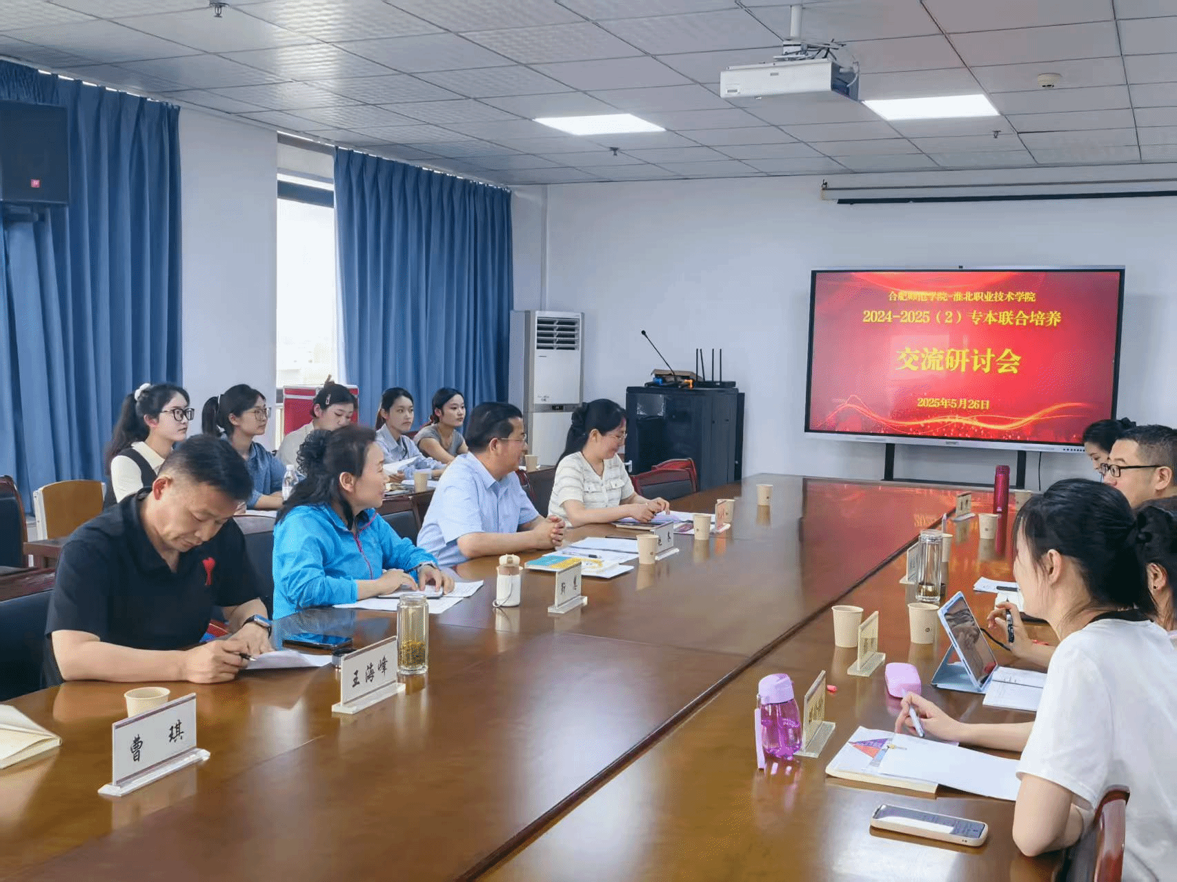 赵冬汇报了2025年以来的专本联合培养工作。现场播放视频,全方位展示小学教育专升本学生在淮北职业技术学院的生活、学习、学生管理、社团活动、主题班会、见习实践等情况。对下一步两校合作交流表达殷切期望。
