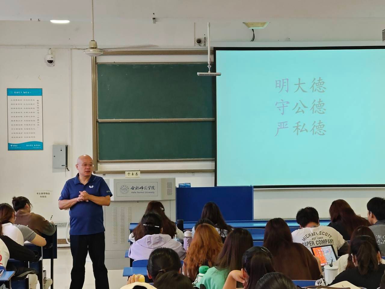 本网讯 为进一步加强师范生师德教育和实习工作,9月21日上午,永利集团304am登录在锦绣校区逸夫楼A201教室开展师德教育活动。学院邀请合肥市屯溪路小学书记、校长卞玉昌以《从文化属性探究师德的现实意义》为主题进行了师德教育指导。永利集团304am登录2021级小学教育专业全体学生参加了活动,活动由永利集团304am登录副院长闫龙主持。