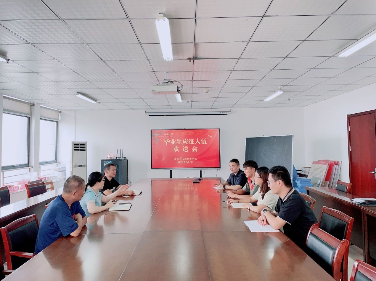 (本网讯)携笔从戎书青春本色,建功军营圆强国梦想。9月7日下午,永利集团304am登录在锦绣校区行知楼710会议室举行毕业生应征入伍欢送会,学院党委书记董萍,党委副书记陈帅帅,党委委员、副院长闫龙,辅导员王磊、屠家宝、唐淼及学院应征入伍毕业生代表艾则等参加会议。会议由董萍主持。
