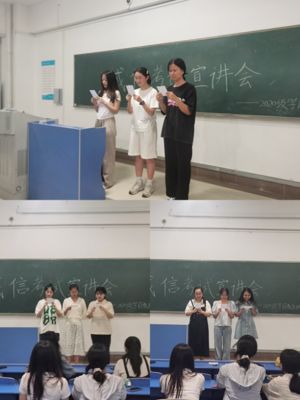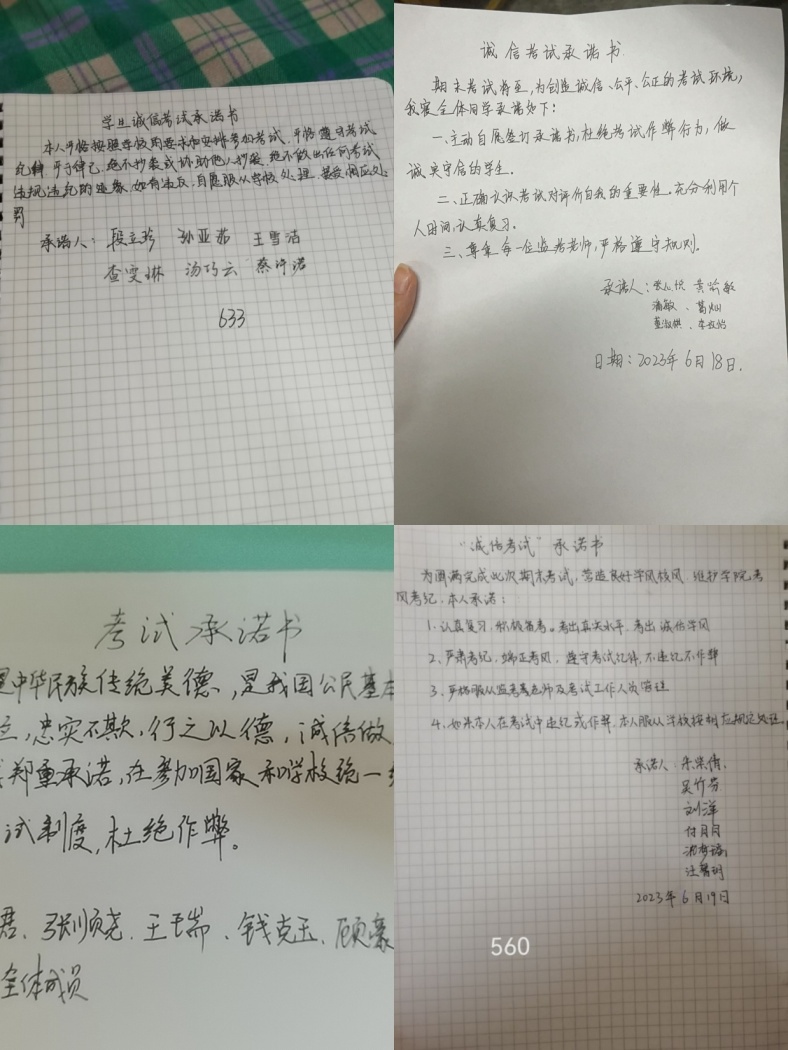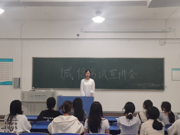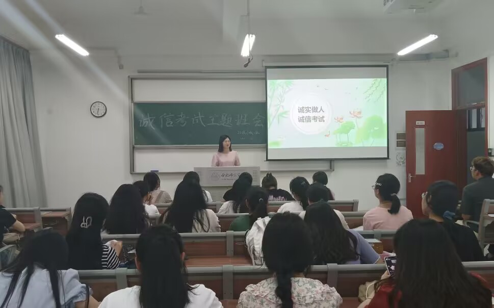 6月16日,辅导员唐淼、屠家宝、胡蝶分别在锦绣校区和滨湖校区召开“诚实做人诚信考试”主题教育班会,向同学们宣讲诚信的内涵及“失信”的危害,结合学校《关于考试违纪和作弊处分条例》,进一步强调每位学生要充分利用时间积极备考,要以诚信的态度对待每场考试,严格做到诚实守信、严谨自律。会后,各年级还举行了主题演讲、诚信考试承诺签名、诚信考试宣誓等活动。