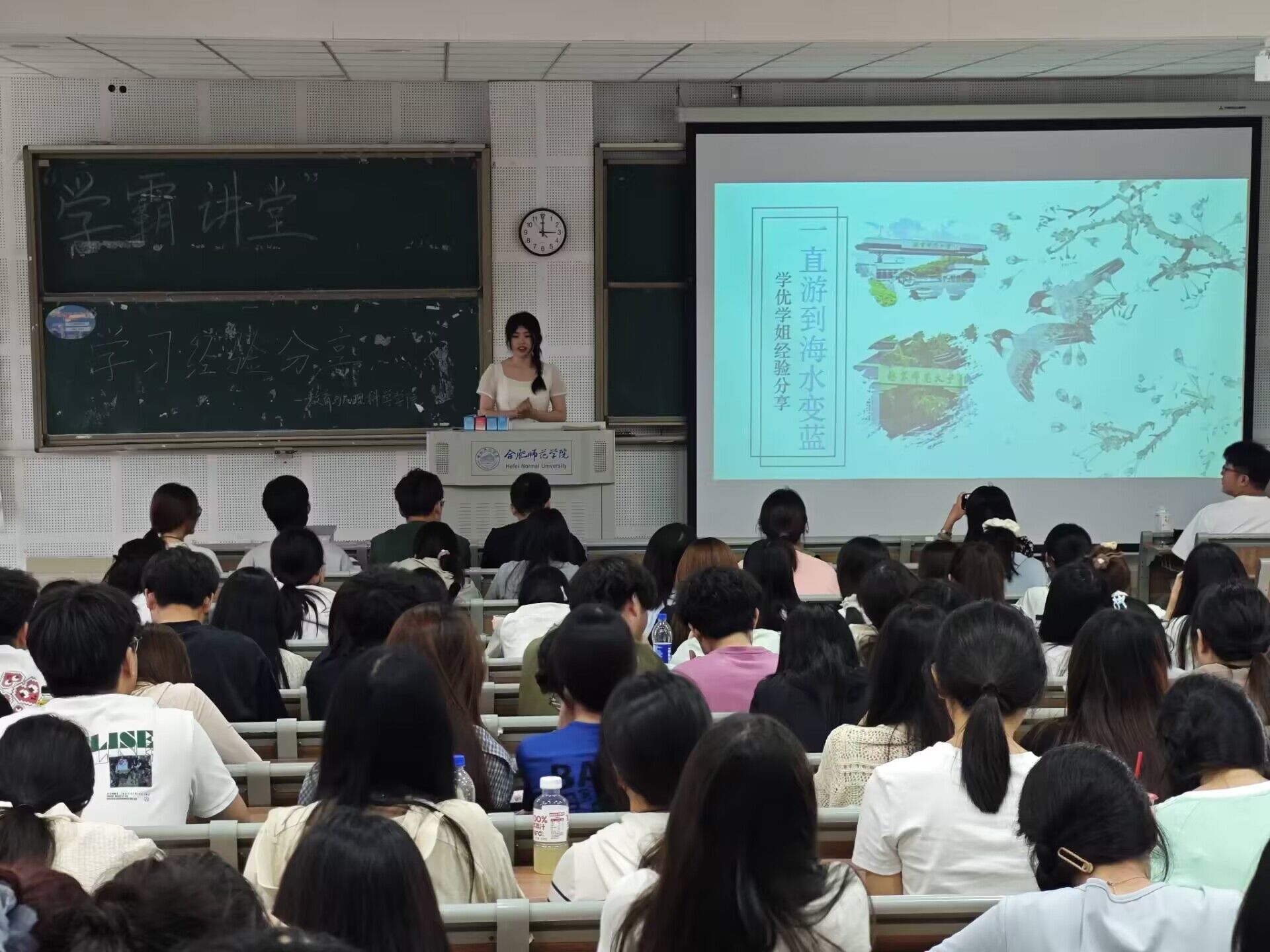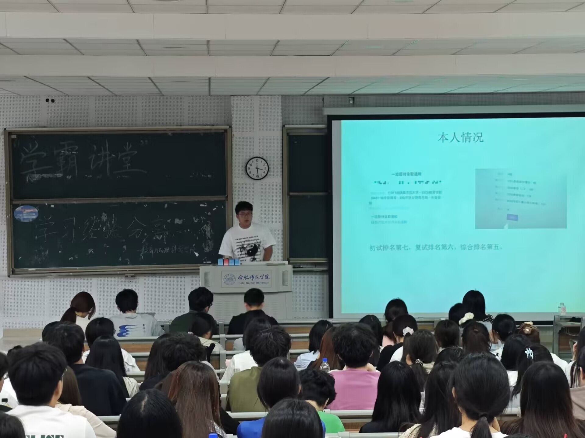 为充分发挥优秀学子榜样引领作用,助力青年学生掌握学习方法、明晰发展方向、激发学习热情,5月14日,永利集团304am登录在滨湖校区博学楼D101教室举办“学霸讲堂”活动。永利集团304am登录国家奖学金获得者、2024年度“感动合师”十大青年学生之拼搏人物——2021级小学教育专业王学优,考取陕西师范大学硕士研究生、2021级学前教育专业胡鹏,以及2024年度十佳班级、五四红旗团支部标兵获得者——2022级小学教育4班班长柏雪作为优秀学生代表,分享了学习经验和成长心得,2023、2024级200余位同学参加了学习分享。